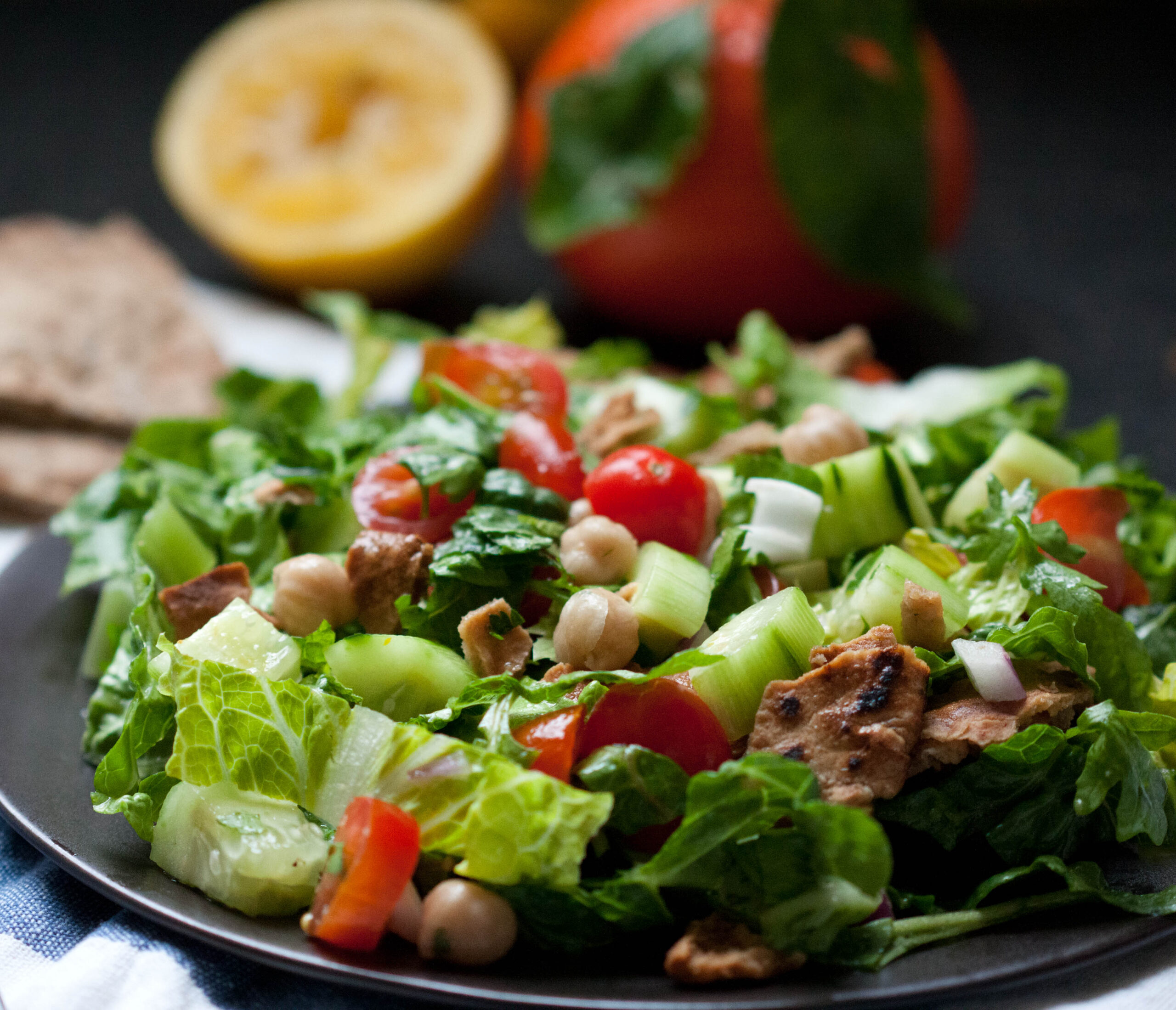 There’s this wonderful Mediterranean restaurant back in Marin called Insalata’s and they serve the best fattoush I’ve ever had. After trying it a few times, I set out to duplicate it, and have come pretty darn close with the recipe I’ll share with you here in a minute. The nice thing about fattoush is, regardless of the season, you can find most of the ingredients in your local market.  And I love that, with the addition of baked pita chips and garbanzo beans, it’s a nice meal in and of itself. Oh, and  most importantly: the fresh, citrusy dressing brightens up even the gloomiest of days.