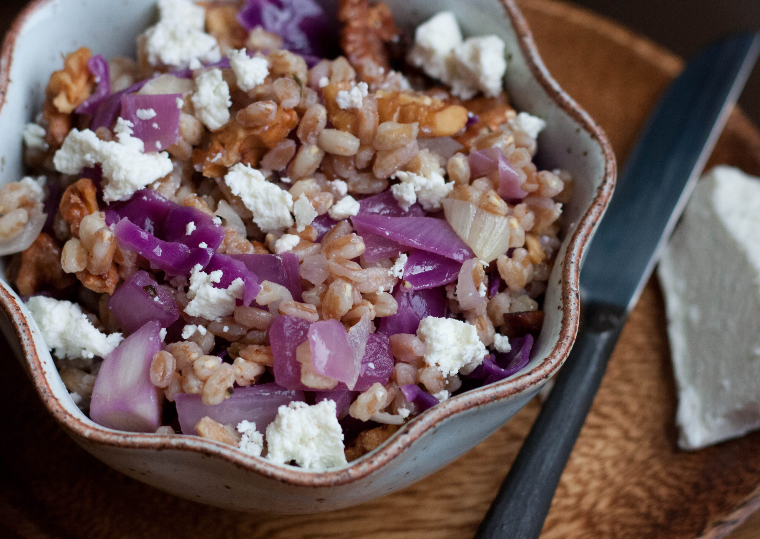 I was drawn to this recipe because it looked like a fairly perfect dish to me. While I’m no longer a vegetarian, I cook that way most of the time and I’m a big farro fan. Yep, I’ve been in farro’s corner for a long time now. So this warm salad combines colorful cabbage, crunchy walnuts, hearty grains of your choosing (could use barley, spelt, wheat berries, or short grained brown rice) and the delightfully crumbly and slightly salty ricotta salata. It’s got a lot going for it. And I’m pretty sure you’ll love it as much as I did, whether you’re a worn-in boxer shorts or a cocktail dress kind of gal.