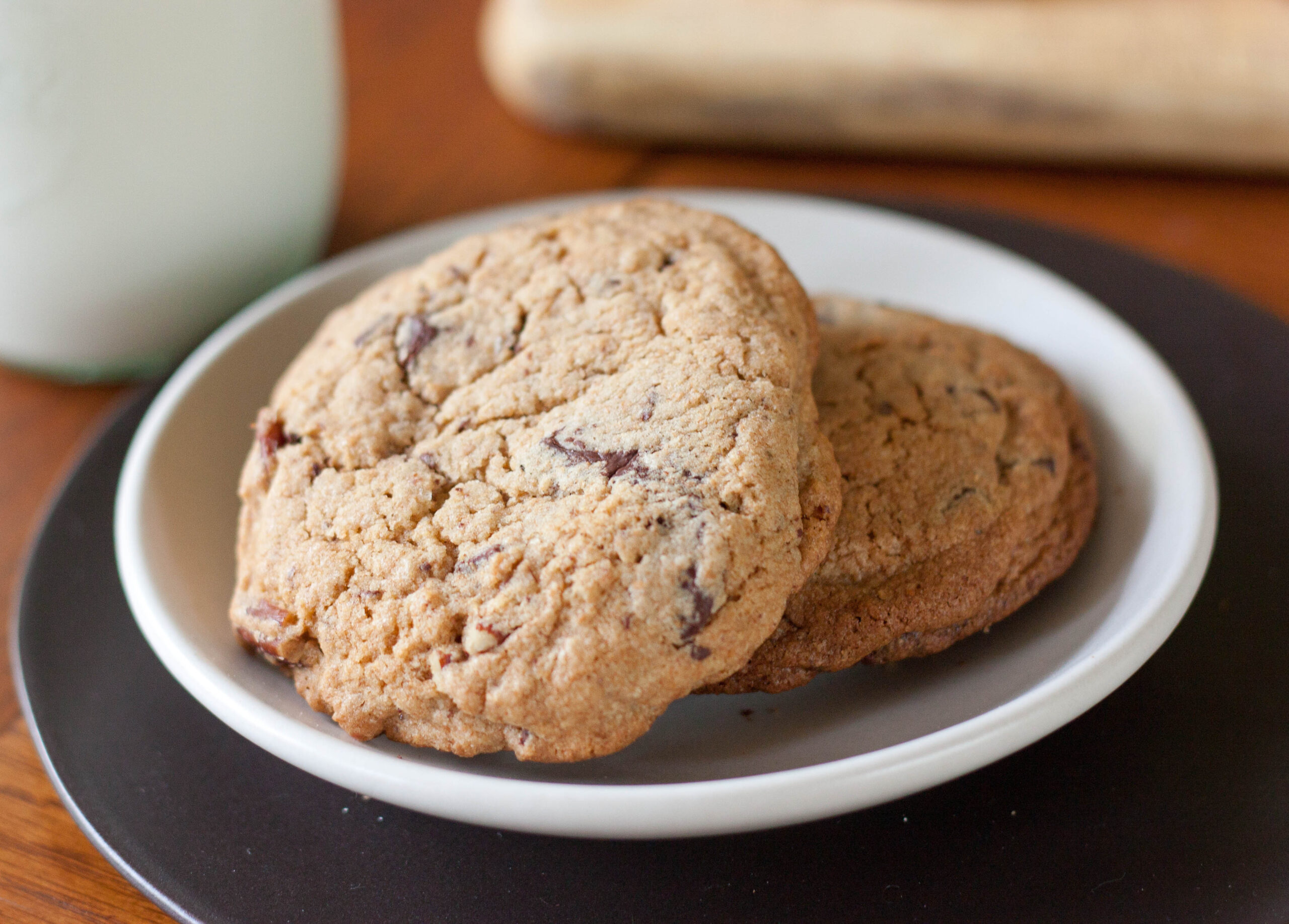 Now Good to the Grain is organized in chapters according to the type of whole grain flour Kim’s using. So while there are certainly more exciting recipes I suppose (Muscovado Sugar Cake, Rhubarb Tarts, Figgy Buckwheat Scones), you can’t go wrong with a solid chocolate chip cookie and I was intrigued with Kim’s use of cold butter, 100% whole wheat flour, and atypical amount of kosher salt. Now while I may be known for hyperbole, I have to say I’m not sure I’ll ever make another chocolate chip cookies recipe again. I’ve fallen in love. Kim’s recipe yields a chewy, almost nutty cookie with uneven shards of bittersweet chocolate and glints of kosher salt. It’s a sturdy cookie begging for a glass of milk. But it’s also a delightfully decadent cookie, perfect all on its own.