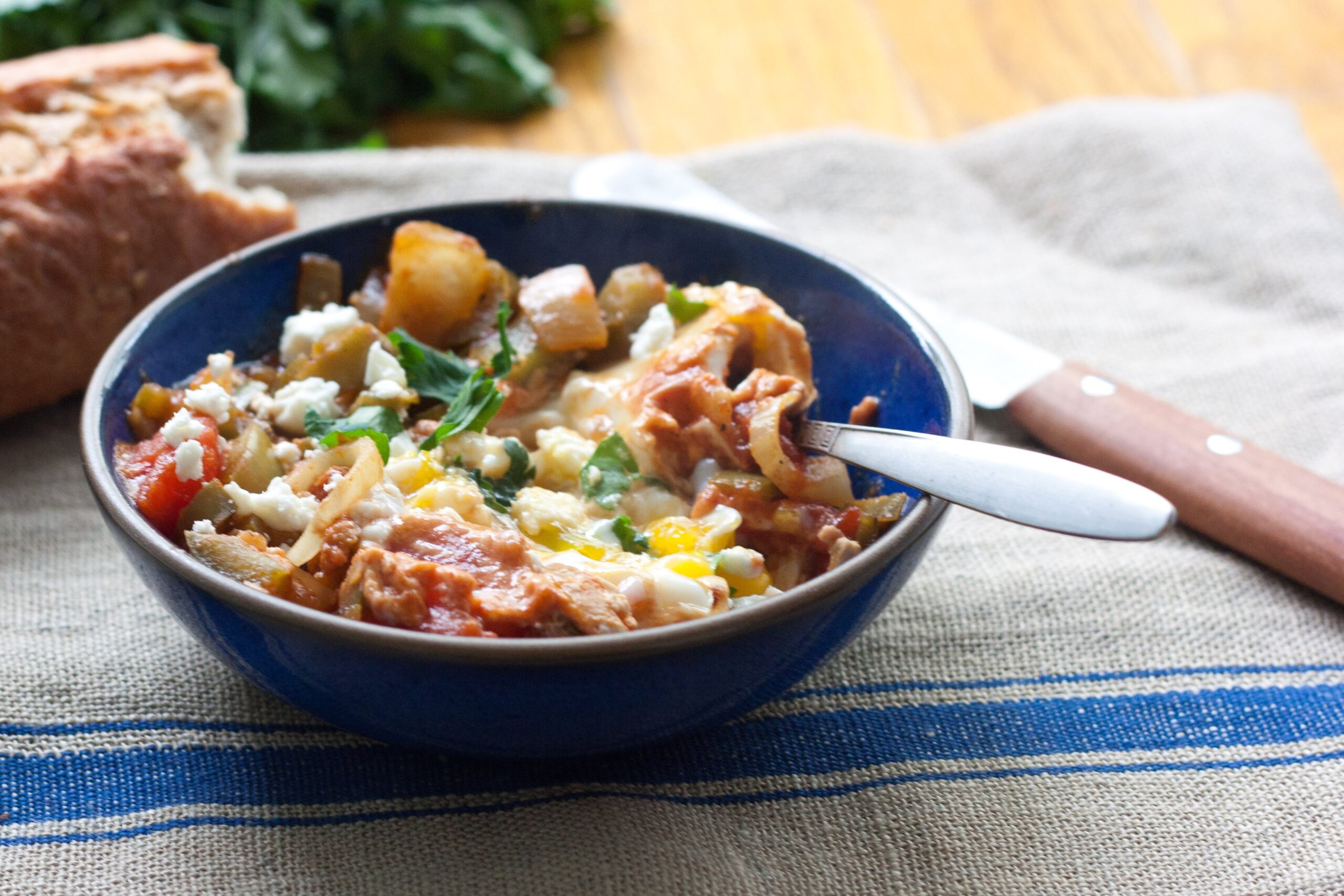To serve: Spoon the sauce and eggs into a bowl and top with parsley and feta. Serve hot with warm crusty bread.
