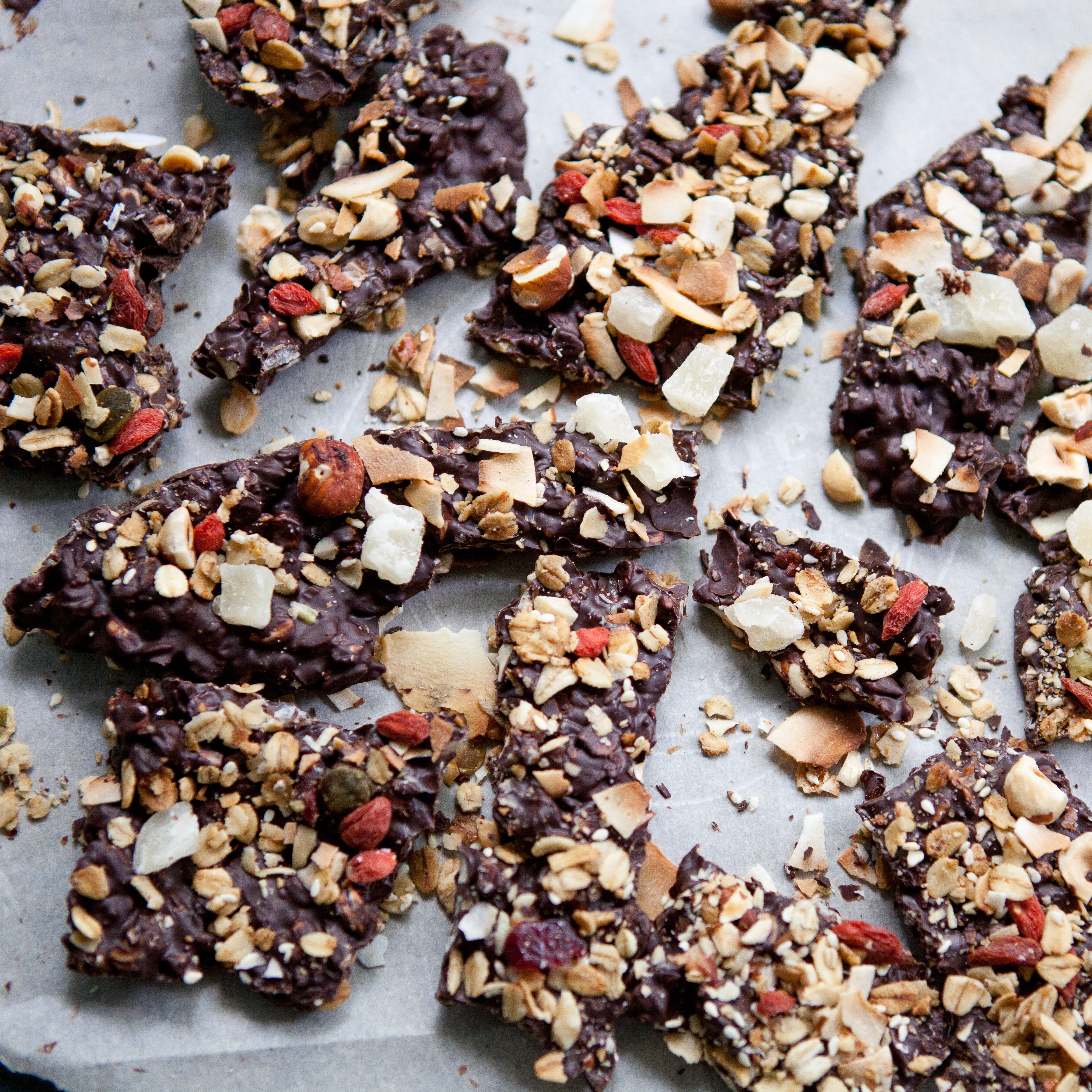 Scrape the chocolate onto the baking sheet and spread it in a 1/2-inch thick layer. Sprinkle a little extra fruit, nuts, coconut and granola on top. Let the bark cool to room temperature then refrigerate for at least 3 hours and up to 1 day to firm up. Break into pieces and store room temperature in an airtight container.