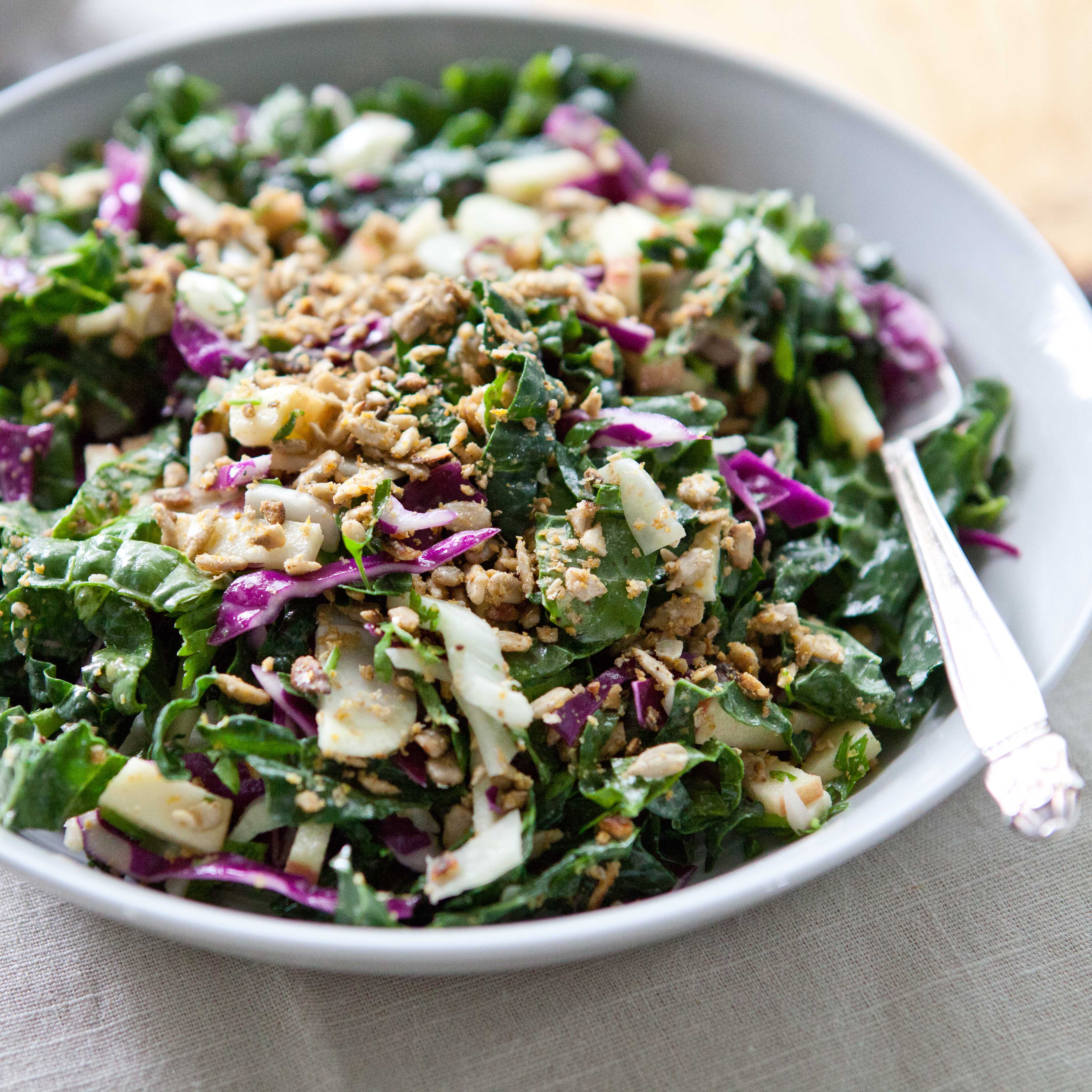 I’m not sure about you, but the produce at our farmers market has been largely cabbage, kale, brussels sprouts and a few root vegetables. Hello, February. That being said, there’s a lot of different ways to get in on the February action, and I think this salad has much of the best our season has to offer: hearty kale; sweet little bits of apple; bright, snappy fennel; vibrant cabbage and parsley. At times I’ll swap in radishes for the apple or a big handful of grated carrots. I’ve been pondering adding citrus next time around. In other words, the salad is forgiving: whatever you’re most excited about that gets you out of the occasional seasonal doldrums is a good inclusion. The whole thing is tossed with a lemony tahini dressing that I’ve come to really love — and this version is topped with a Sunflower Crumble I just read about over on My New Roots.