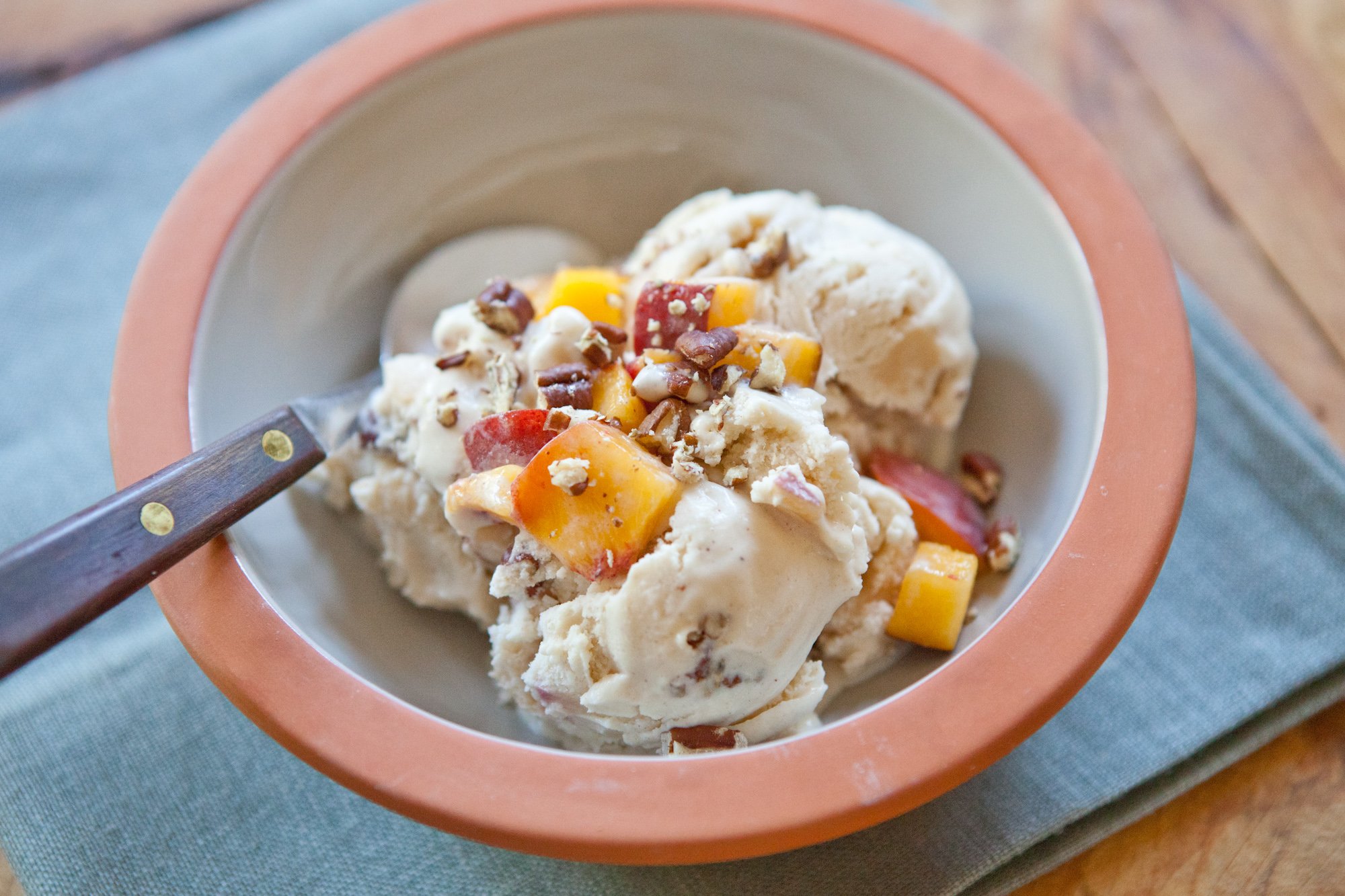 Churn the ice cream according to the manufacturer’s directions. In the last minutes, add the toasted pecans and half the peaches. Spoon the mixture into the storage container and freeze until firm.