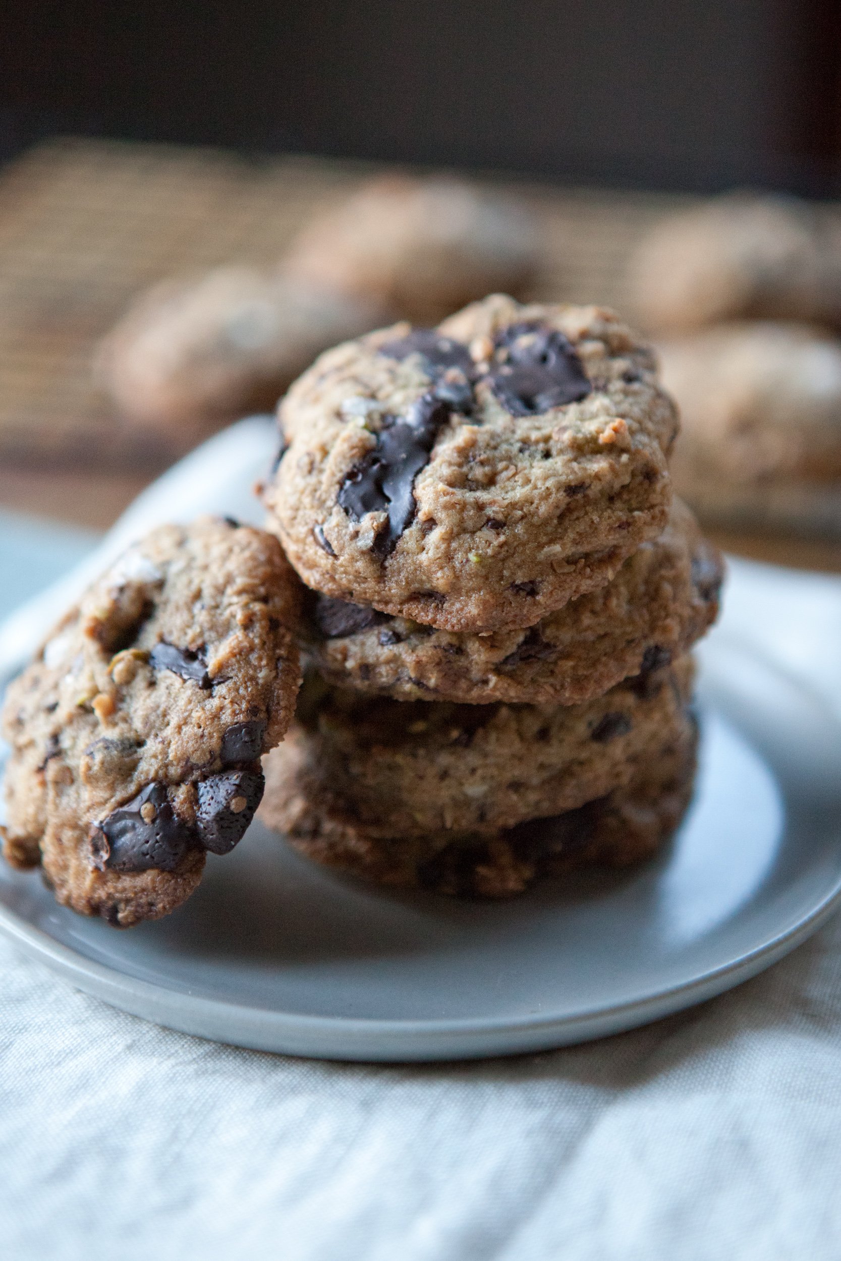 I was intrigued by these cookies when I noticed that they call for coconut oil instead of butter. This makes them a little lighter than a traditional chocolate chip cookie. I made a few tweaks, using half spelt flour and turbinado sugar instead of granulated sugar. Certainly use all-purpose flour and granulated sugar if you’d prefer. But I think these cookies are pretty forgiving and a good chance to experiment with a whole grain flour if you’d like. If you don’t have pistachios, any nut would be great here. I’m aiming to make these again with walnuts or pecans and an additional handful of coconut.